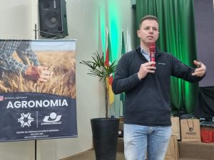 A segunda palestra foi do agrônomo Robson Suhre Campos, especialista em biotecnologia, fertilidade do solo e nutrição de plantas. O título de sua palestra foi: “Da porteira Para Dentro: Aspectos Práticos da Aplicação de Insumos Microbiológicos”. Nascido em Ibirubá, Robson é egresso do Curso de Agronomia da Unicruz e hoje atua pelo Grupo Cropfield, em regiões produtoras de todo o País. Na condição de gerente de pesquisa e desenvolvimento Robson Campos, trabalha com uma agenda intensa de viagens e consultorias durante todo o ano, desde o RS até Rondônia.