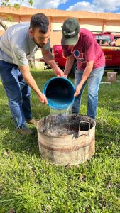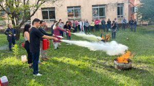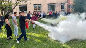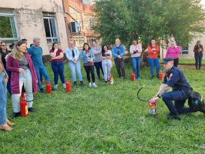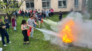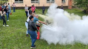 A aula prática do uso de extintores, aconteceu em área gramada ao lado do Ginásio de Esportes – e foi pura adrenalina. Os bombeiros trouxeram extintores de várias classes de incêndio e atearam fogo em tonéis com líquidos inflamáveis e madeira. Os participantes foram provocados a reconhecer os tipos de rótulos, conforme o incêndio a ser combatido. E depois de romper os lacres dos extintores, todos direcionaram o jato contra os tonéis extinguindo o fogo.