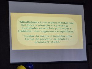 A terapeuta especialista em bem-estar Denice Andrade levou todo o plenário da SIPAT 2025, a um momento de descontração e meditação com uma prática de atenção pura – que em outras palavras segue a tradução consensual do termo inglês “mindfulness”. Uma prática que foi sistematizada pelo cientista Jon Kabat-Zinn, do estado norte-americano de Massachusetts, na década de 70, com foco na redução do estresse e da ansiedade – e, por consequência, melhorando a capacidade psicológicas dos indivíduos.