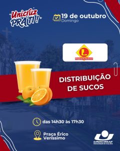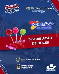 O aspecto mais festivo da comemoração de aniversário da Unicruz, terá apelos agradáveis aos diferentes tipos de público como a distribuição gratuita de pipoca, balas, pirulitos e sucos – cortesia de entidades parceiras como o supermercado Linassi, a cooperativa Sicoob e o Atacado Komprão Mais Linke. Também serão oferecidas por outras empresas parceiras – uma exposição de motos elétricas da Maleski Motos, oficina educativa para crianças com a Vital Vet e orientações e cuidados bucal com a Odonto Top.