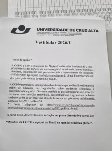 Os candidatos ao processo seletivo para ingressar na Unicruz a partir do primeiro semestre de 2026, receberam como tema da redação: “Desafios da COP30 e o papel do Brasil na agenda climática global”. O tema se baseou no encontro onde líderes mundiais, a comunidade científica e organizações ambientalistas não governamentais, discutiram ações para combater as mudanças climáticas.