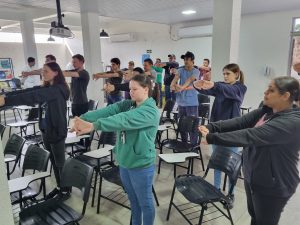 Um grupo de acadêmicos do Curso de Fisioterapia da Unicruz, esteve realizando no dia 23/04, uma ação de cuidados relacionados à prevenção de acidentes e à promoção da saúde no ambiente de trabalho, no centro de convivência dos funcionários da indústria metalúrgica Fockink, na cidade vizinha de Panambi.