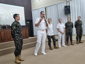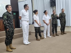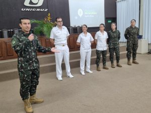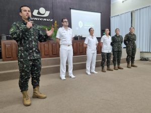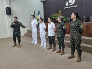 O grupo de oficiais que representou o comando da Artilharia Divisionária – AD/3, esteve integrado pelo Major Máximo e os tenentes Cabeda (médico), Isabelle (enfermeira), Thaís (advogada), Lara (farmacêutica), Corrales e Camila (odontólogas). Pela Unicruz, compareceu a Pró-Reitora de Graduação Vera Lúcia Freitag e os professores Fernando Voloski, Luana Possamai Menezes e Paulo Konrad. A assistência registrou 95 acadêmicos inscritos.