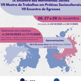Inscreva-se aqui: https://www.even3.com.br/xii-simposio-de-praticas-socioculturais-ix-encontro-de-movimentos-sociais-vii-mostra-de-trabalhos-em-praticas-socioculturais-vii-encontro-de-egressos-do-ppg-645575